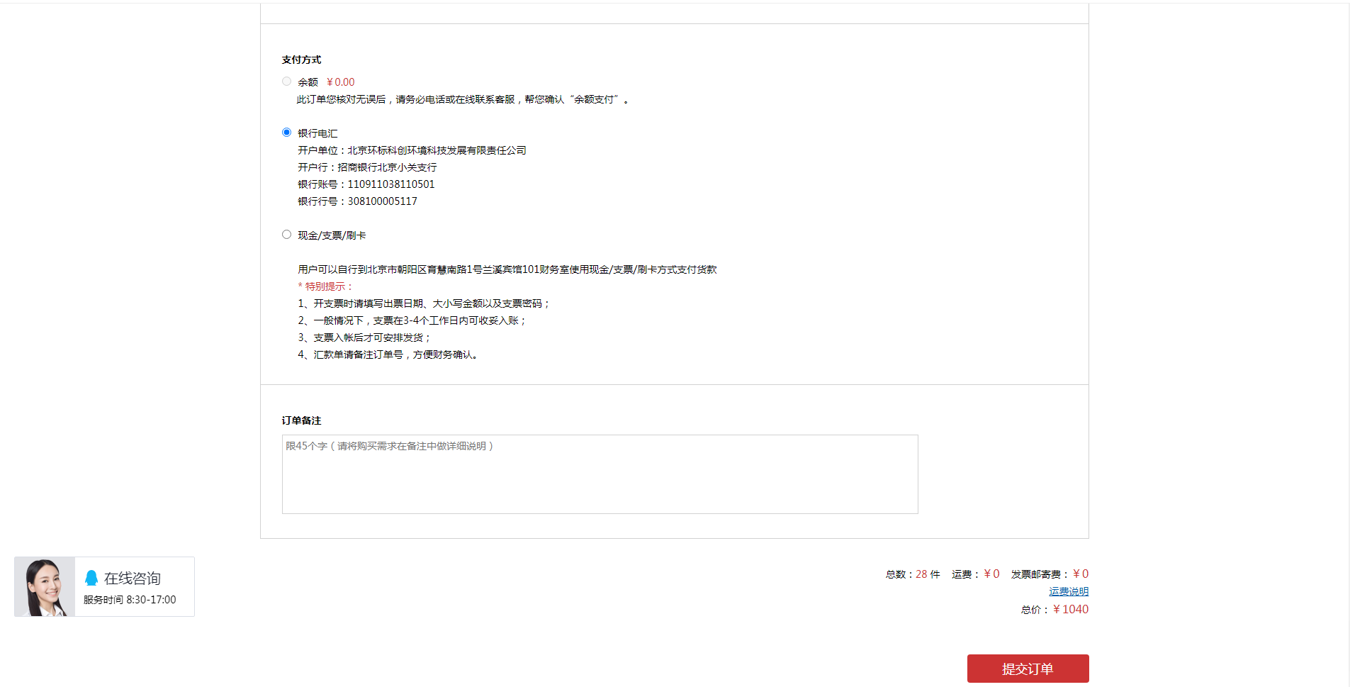 我們目前支持銀行電匯/網銀轉賬、現場付款、預存款三種支付方式,正常情況下,我們會在1-2個工作日內確認到款。